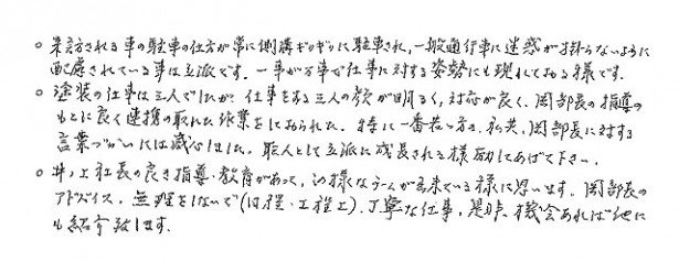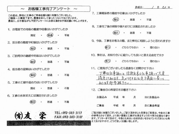 | コメント | お客様よりアンケートをいただきました。 また、温かいお声も頂戴いたしましたので、下記の「施工例をもっと見る」ボタンよりご覧ください。 |